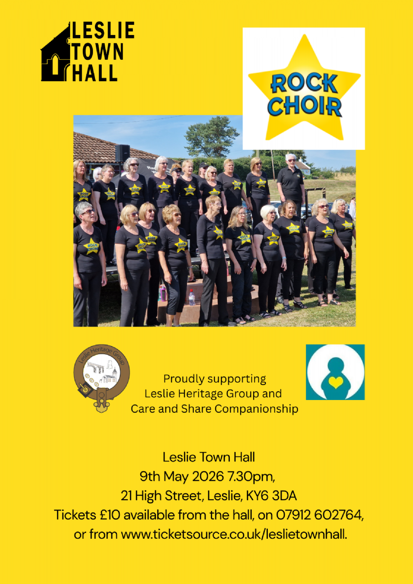 Glenrothes Rock Choir will be singing for us at Leslie Town Hall on Saturday 9th May. Tickets cost £10 and are available from the Town Hall box office or from Ticketsource using this link: http://www.ticketsource.com/leslietownhall